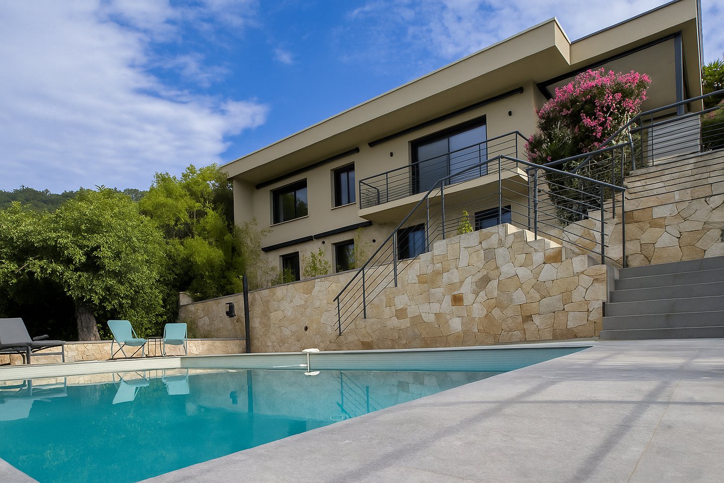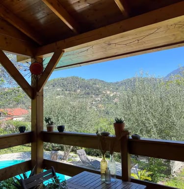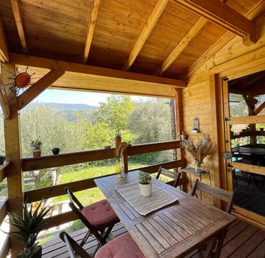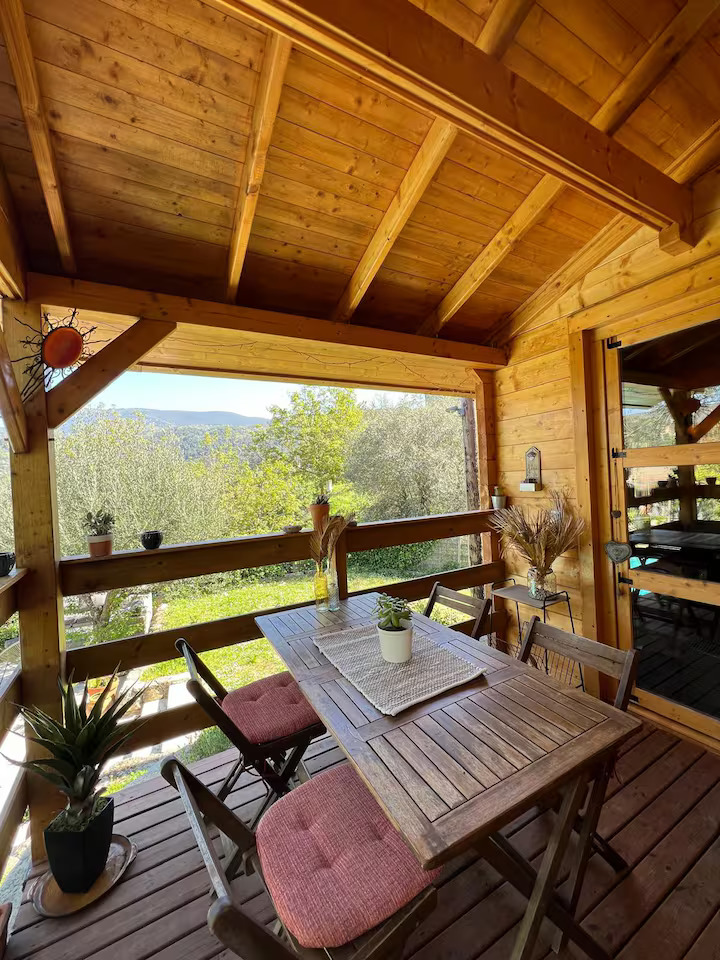Le chalet en bois de deux chambres situé à côté du studio propose des lits doubles, un salon confortable et un accès facile au jardin, au barbecue et à la piscine. Après une longue session, vous pouvez traverser le jardin et vous endormir au son des oiseaux.